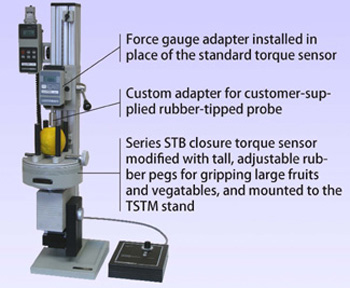 An agricultural testing laboratory required an accurate way to quantify fruit and vegetable ripeness. The customer's specification called for twisting a rubber-tipped probe onto the skin of the fruit or vegetable, while pressing down at a specified force, until the skin breaks. This test was previously done by hand with a mechanical device.