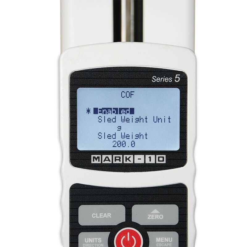 The M5-2-COF coefficient of friction (COF) gauge is an integral part of a COF testing system, typically including a motorized test stand and COF fixture.