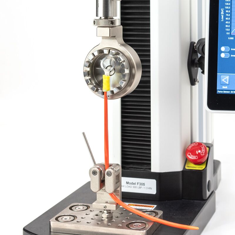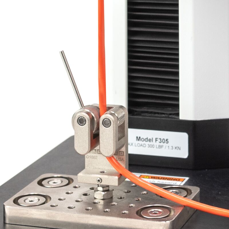 This cam grip secures the ends of wire, cable, and tubing samples for pull testing. Engaging and disengaging samples is quick and easy, with a side slot for sample insertion and serrated steel rollers. Commonly used with the G1001 wire terminal grip.