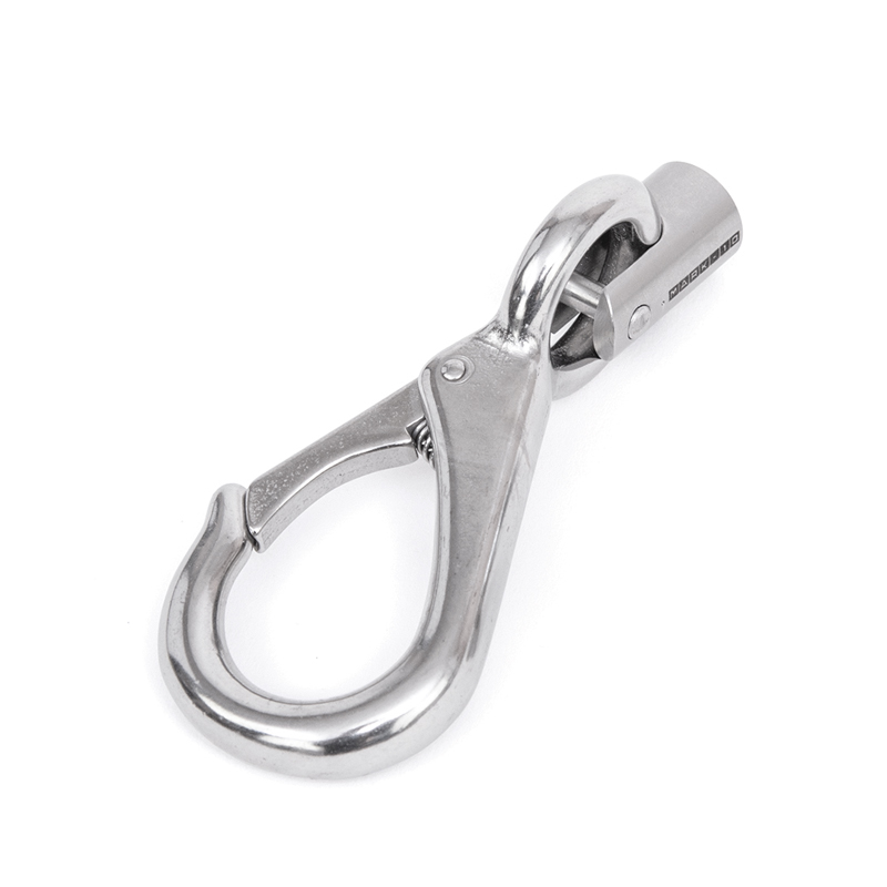 This hook features a snap clasp, for added safety. Swiveling action ensures proper alignment.