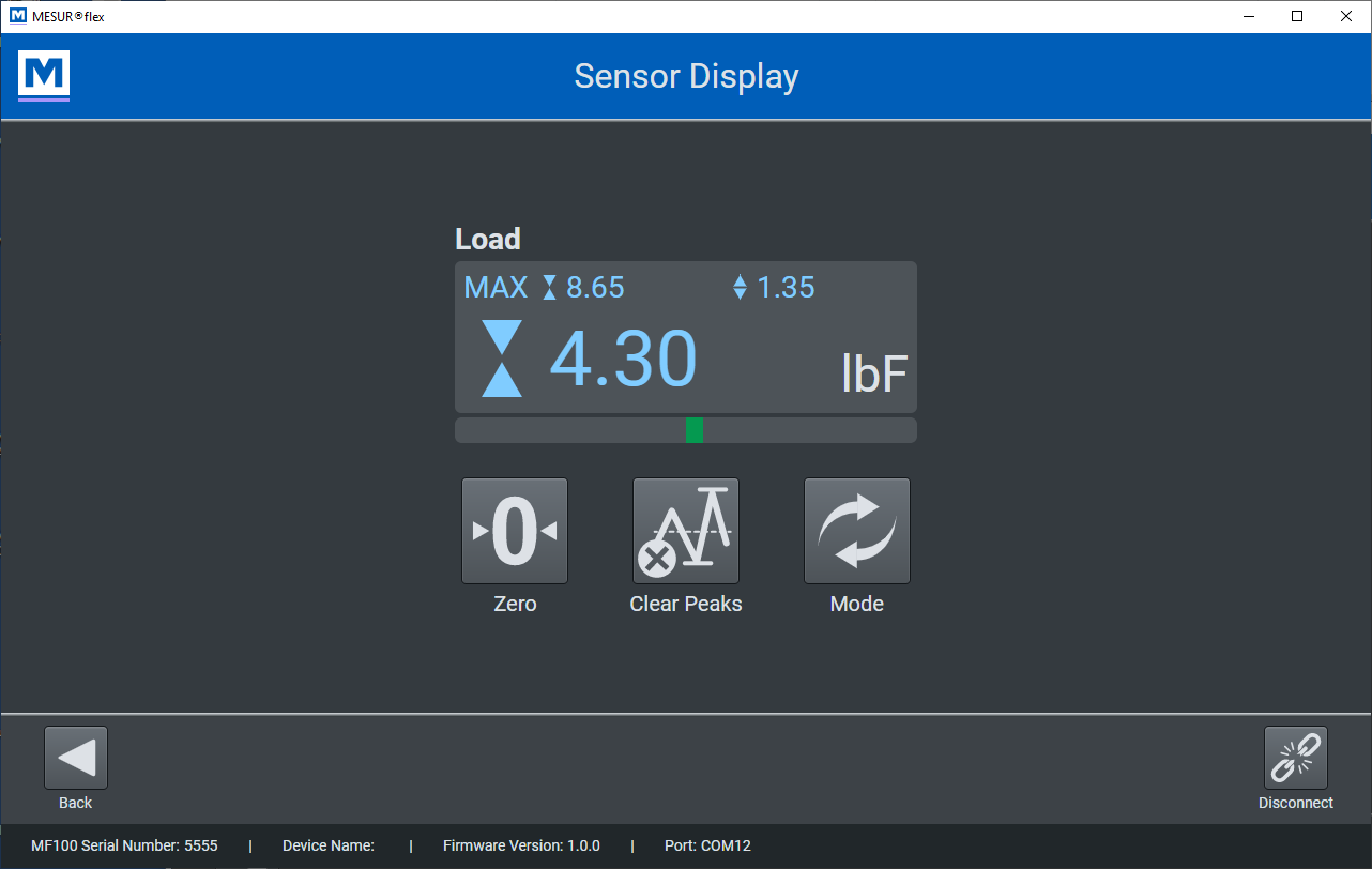 Through MESUR®Flex, select the sensor's capacity, add a unique identifier, and calibrate the sensor through a step-by-step wizard. The software contains basic settings for changing measurement units, viewing peak, real-time, and time-averaged data. Or, control the sensor and acquire data via an extensive library of serial commands, ideal for integration into a data collection system.