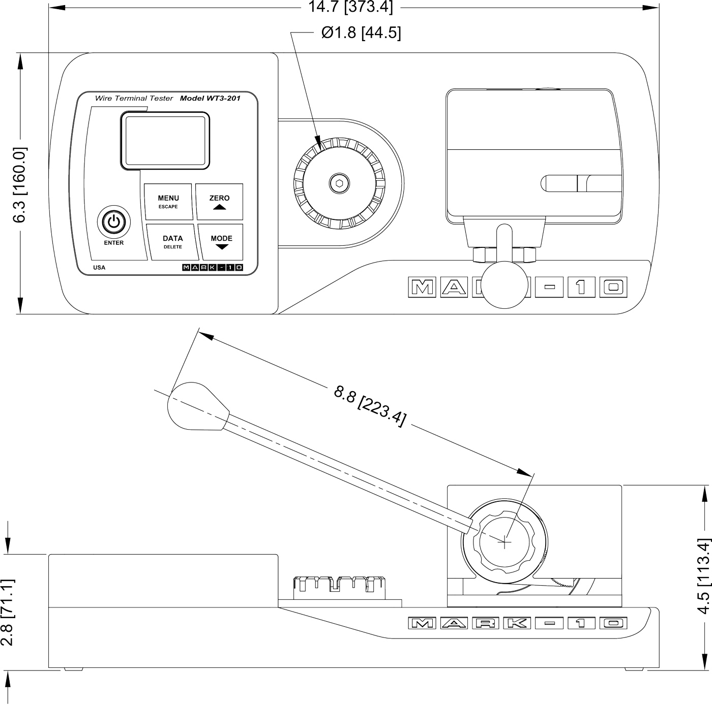 The WT3-201 wire crimp pull tester is designed to measure the pull-off force of crimped wire and tube terminations. An ergonomic lever allows for easy application of up to 200 lbF (1,000 N) of crimp pull force. Adjustable wire terminal grip contains multiple slots for wire diameters up to AWG 3 (0.25 in [6.3 mm]). The tester accommodates most insulation types. Samples can be sent to Mark-10 for evaluation prior to purchase.